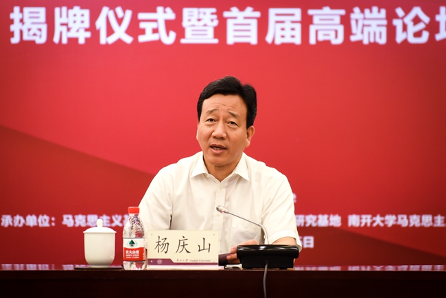 杨庆山在揭牌仪式上指出,建设好国家教材基地,不仅是学术任务,更是一种光荣使命和重大责任。在南开百年的发展历程中,哲学社会科学始终是南开大学的优势和特色,我们始终坚持马克思主义指导地位,高度重视马克思主义理论的发展。基地将立足国家重大需求,汇集国内优秀专业人才,建立灵活、开放、高效的运行机制。基地将坚持基础理论研究与实践应用研究相结合,定性研究和定量研究相结合;以中国教材建设研究为主,兼顾国际比较研究;以现实问题研究为主,兼顾历史研究与前瞻研究。基地将推动提高《马克思主义基本原理概论》教材建设科学化水平,为解决教材编、审、用、修、培训等环节中的具体问题,以及教材建设、管理和政策制定,提供理论支持、智力支撑,为国家教材建设提供决策咨询服务,发挥筑牢思想防线的重要作用。