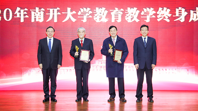 南开大学教育教学奖设立于2019年,每年评选一次,是学校为进一步弘扬百年南开尊师重教的优良传统,落实新时代立德树人根本任务的重要举措。经学院推荐、专家评审、公示等环节,每年评选产生出教育教学奖终身成就奖2人、杰出贡献奖10人、青年教师奖10人,表彰他们在教书育人岗位上为中国高等教育和南开事业发展作出的突出贡献。