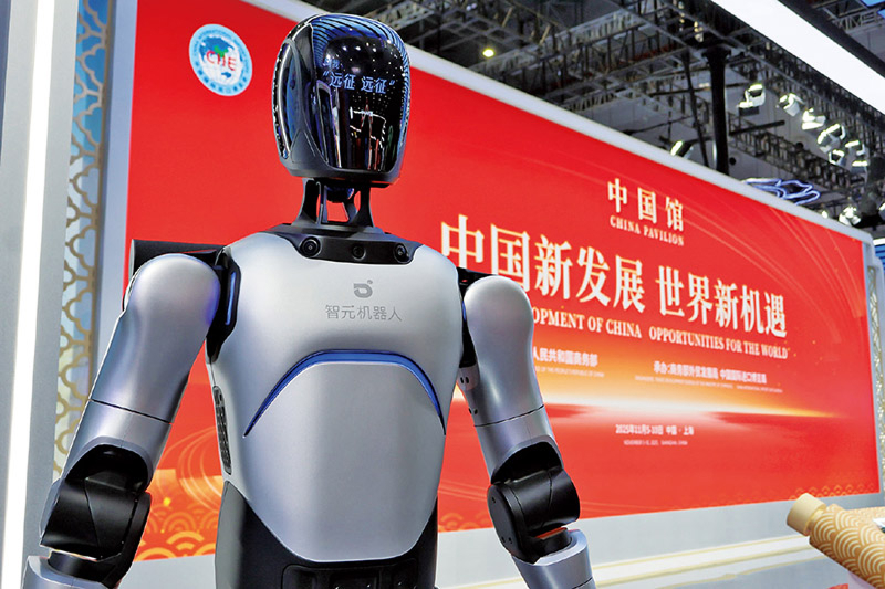 2025年11月5日至10日,第八届中国国际进口博览会在上海举办。本届进博会共有155个国家、地区和国际组织参与,4108家境外企业参展,整体展览面积超过43万平方米,规模再创新高。作为党的二十届四中全会后我国的首场重要经济外交活动,第八届进博会再次向世界郑重宣告,中国开放的大门只会越开越大。图为11月5日,在第八届进博会国家综合展中国馆展示的人形机器人。中新社发 唐克/摄